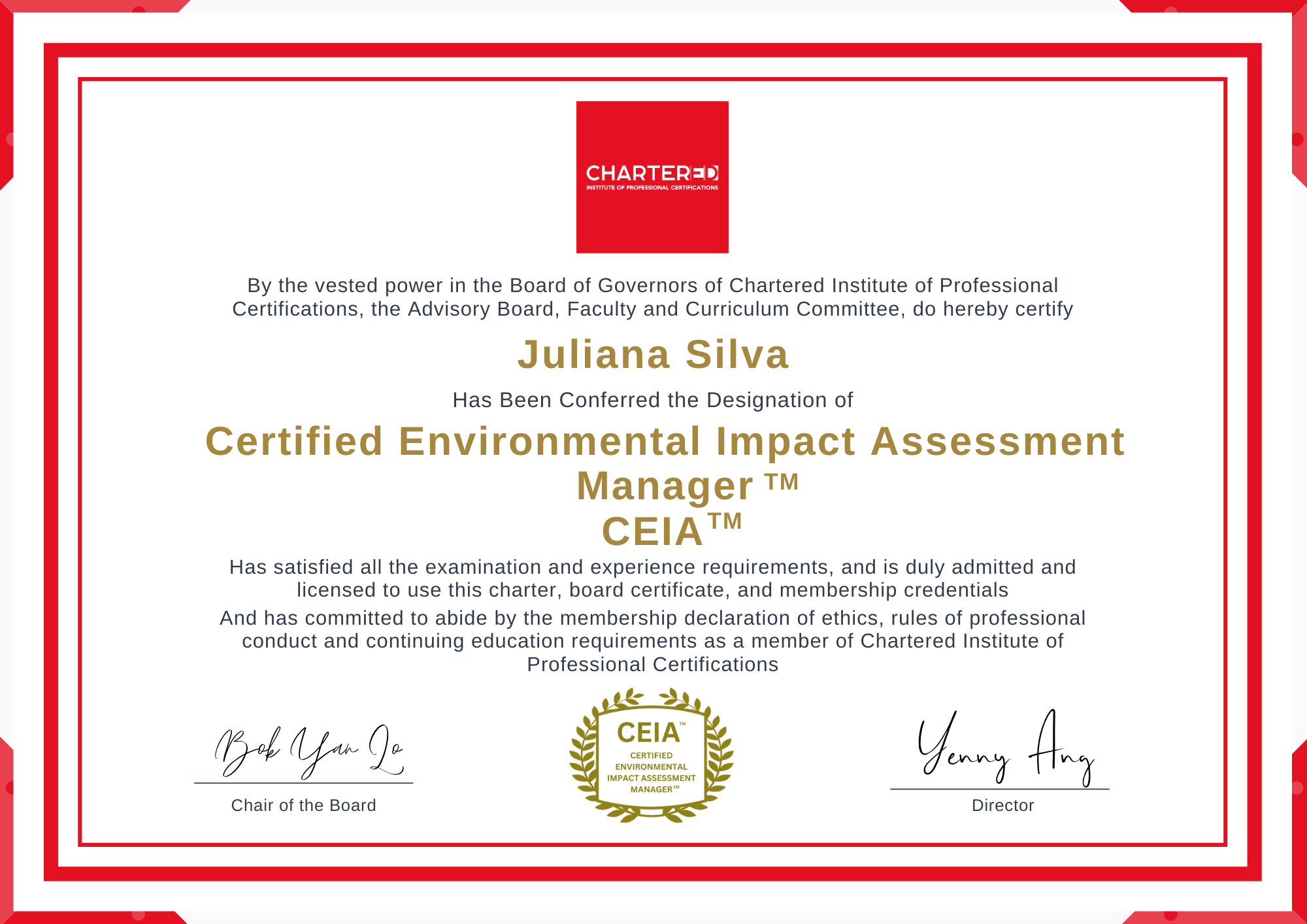 Upon completing the program and passing the Chartered exam, you will attain the Certified Environmental Impact Assessment