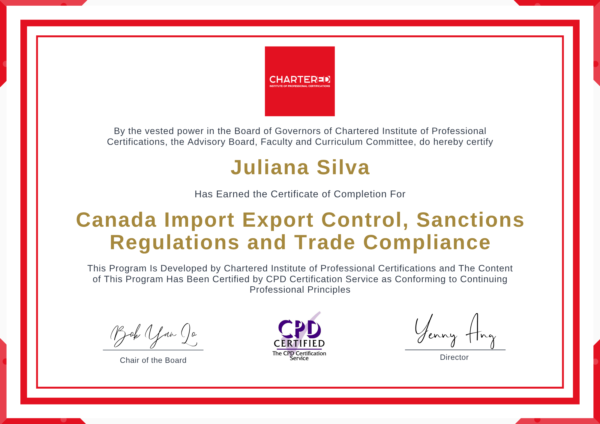 Upon successful completion of the program, you will attain the Certification in Canada Import Export Control, Sanctions Regulations and Trade Compliance. This industry-recognized certification validates your expertise in import-export controls, sanctions regulations, and trade compliance, enhancing your professional credibility as a trusted compliance leader within one of Canada’s most complex and highly regulated international trade environments.