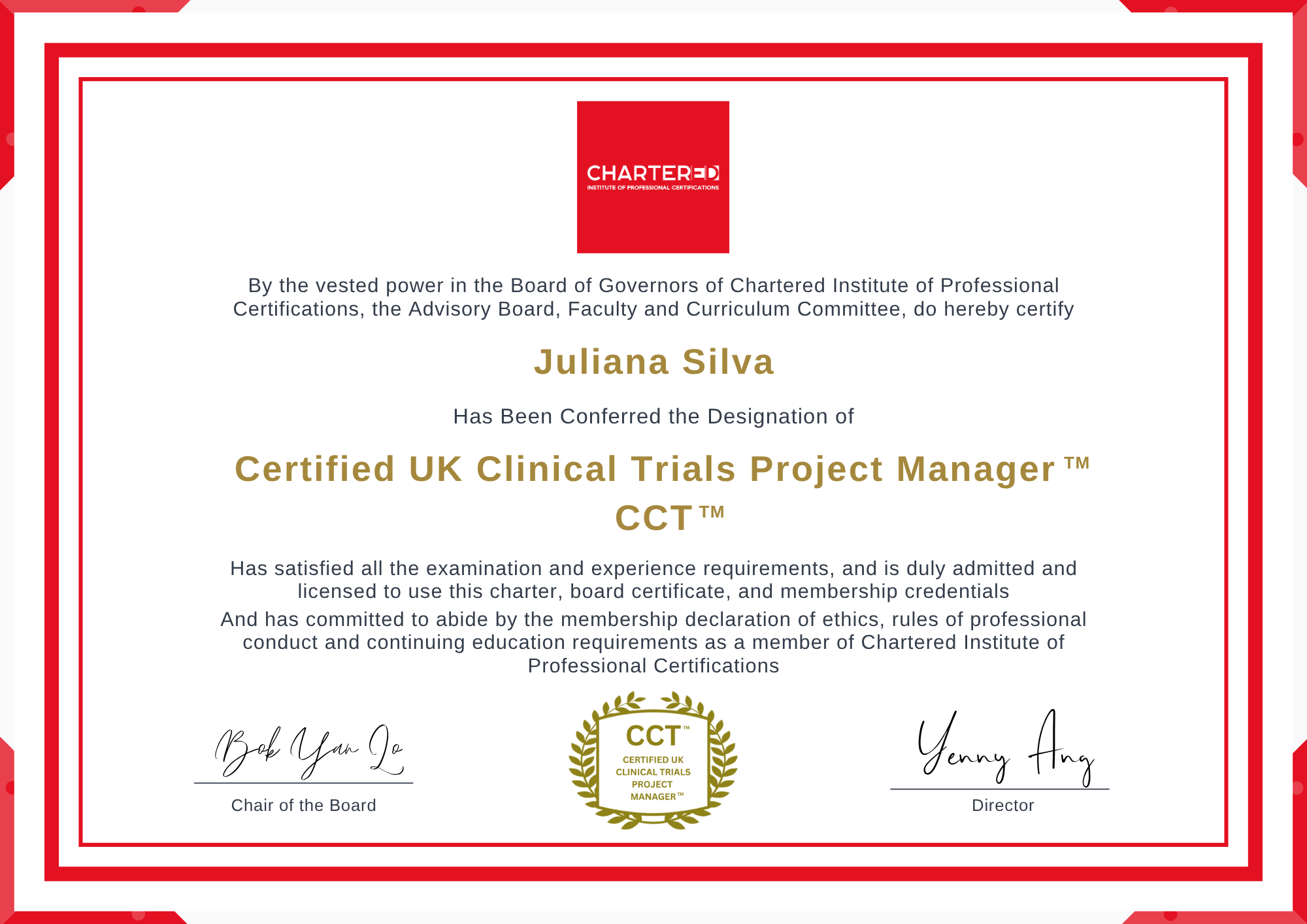 Pricing & RegistrationThis Certified UK Clinical Trials Project Manager (CCT™) is a mark of excellence and distinction that signifies a fully qualified expert possesses profound expertise in applying UK regulatory frameworks to optimize trial efficiency, ensure patient safety, and maintain compliance across UK’s complex clinical research landscape. It is accredited by the Chartered Institute of Professional Certifications, which maintains the governing standards for all members. The CCT™ charter is a trademarked charter available only to professionals who have completed and passed this program. The certification is governed and maintained by Chartered Institute of Professional Certifications with over 90,000 members around the world. It is also endorsed by prominent associations and organizations worldwide.