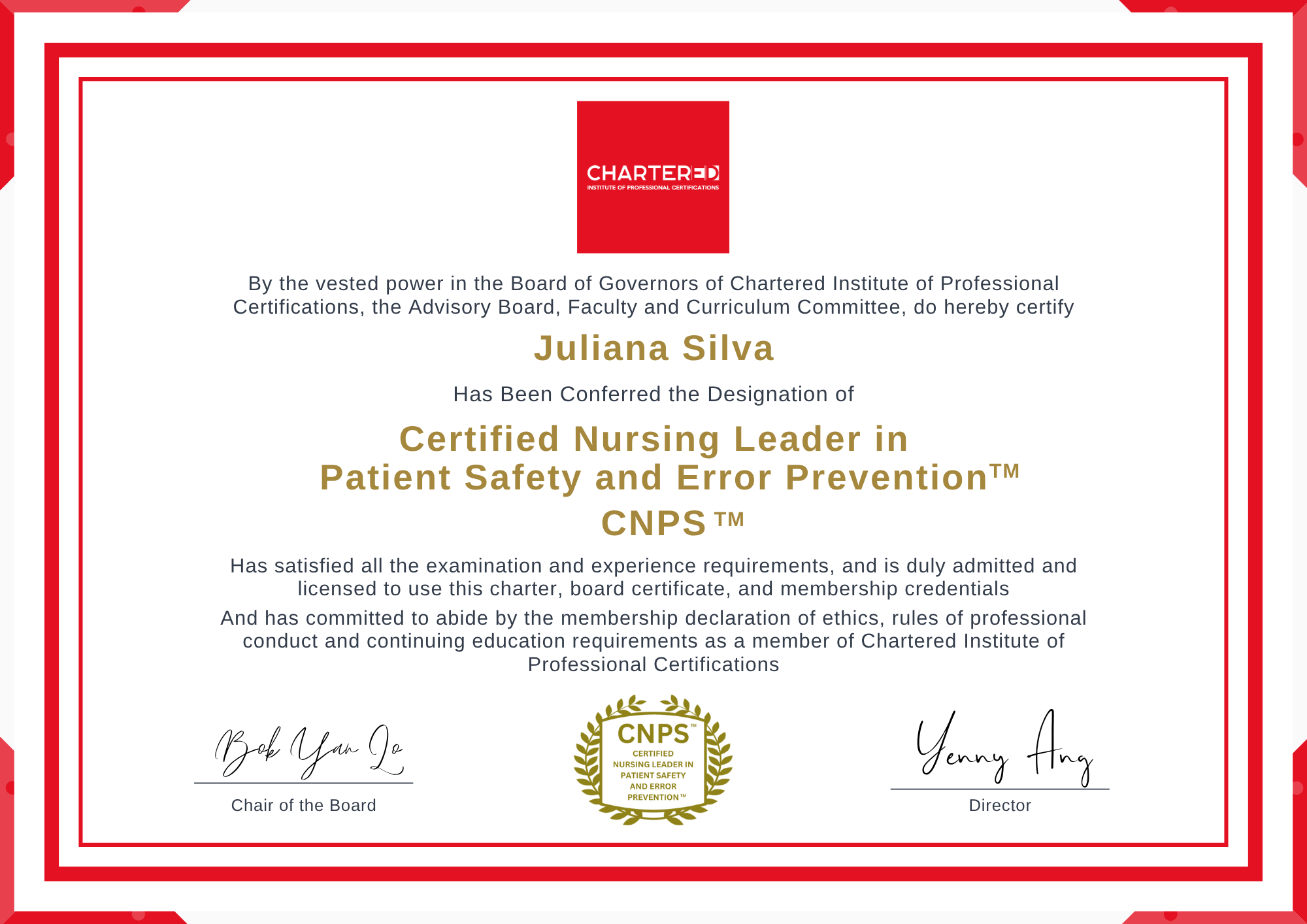This Certified Nursing Leader in Patient Safety and Error Prevention (CNPS™) designation represents the highest standard of professional excellence in nursing leadership, patient safety, and medical error prevention. This credential validates comprehensive expertise in patient safety frameworks, error analysis, prevention strategies, safety culture leadership, and regulatory compliance, establishing you as a recognized authority in advancing quality and safe healthcare delivery. It is accredited by the Chartered Institute of Professional Certifications, which maintains the governing standards for all members. The CNPS™ charter is a trademarked charter available only to professionals who have completed and passed this program. The certification is governed and maintained by Chartered Institute of Professional Certifications with over 90,000 members around the world. It is also endorsed by prominent associations and organizations worldwide.