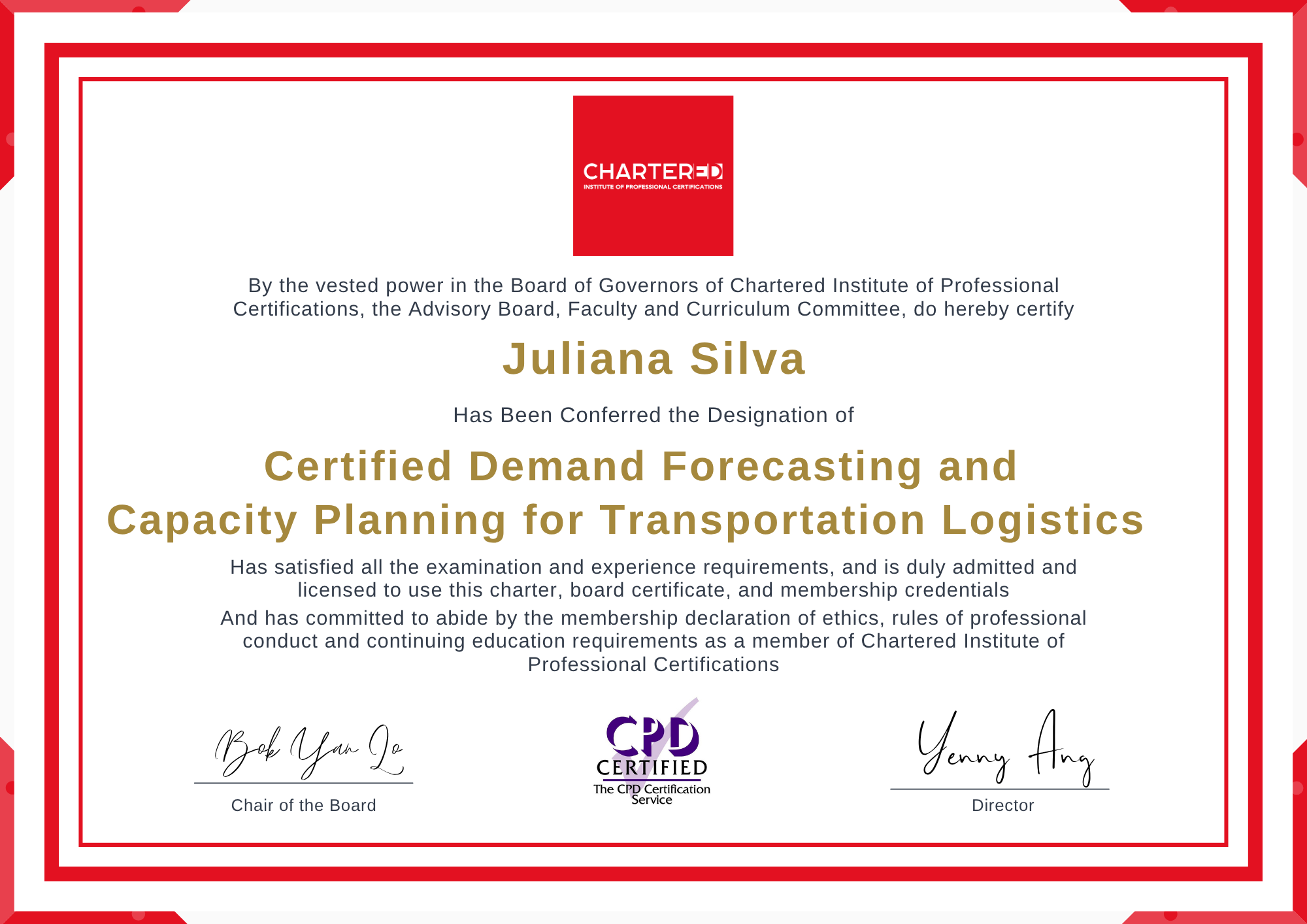 This Certified Demand Forecasting and Capacity Planning for Transportation Logistics credential is a mark of distinction that signifies a fully qualified expert in designing and executing precise demand forecasting and capacity planning solutions that optimize logistics performance and maximize business value. It is accredited by the Chartered Institute of Professional Certifications, which maintains the governing standards for all members. The certification is governed and maintained by Chartered Institute of Professional Certifications with over 90,000 members around the world. It is also endorsed by prominent associations and organizations worldwide.