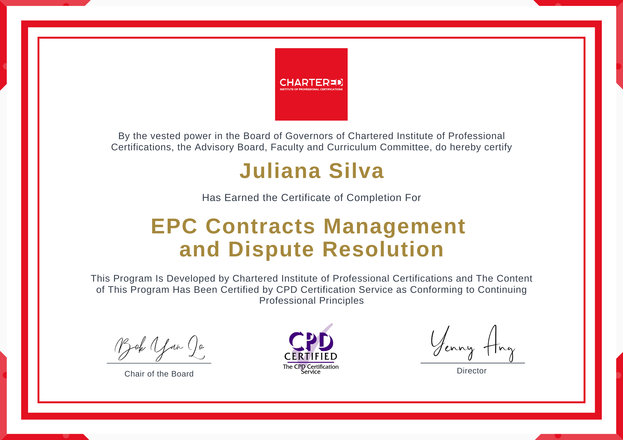 Globally demanded and recognized, this certification will amplify your professional qualifications and demonstrate your expertise in structuring, negotiating, and administering complex EPC contracts while effectively managing claims, disputes, and regulatory compliance across domestic and international construction projects, from contract formation through arbitration, adjudication, and enforcement in both public-private partnerships and cross-border infrastructure ventures. Developed by Chartered Institute of Professional Certifications, the content of this program has been independently accredited by CPD Certification Service as adhering to the highest standards of continuing professional principles.
