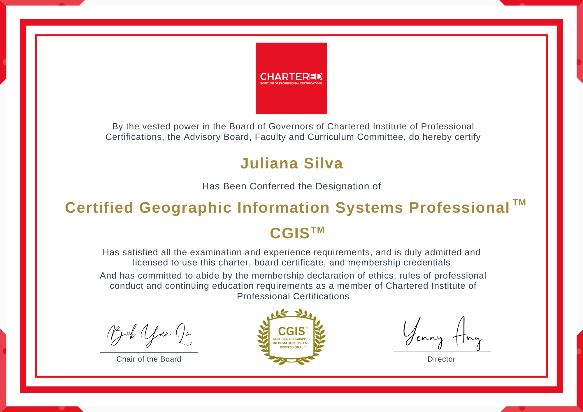 Upon successful completion of the program, you will attain the Certified Geographic Information Systems Professional (CGIS™).