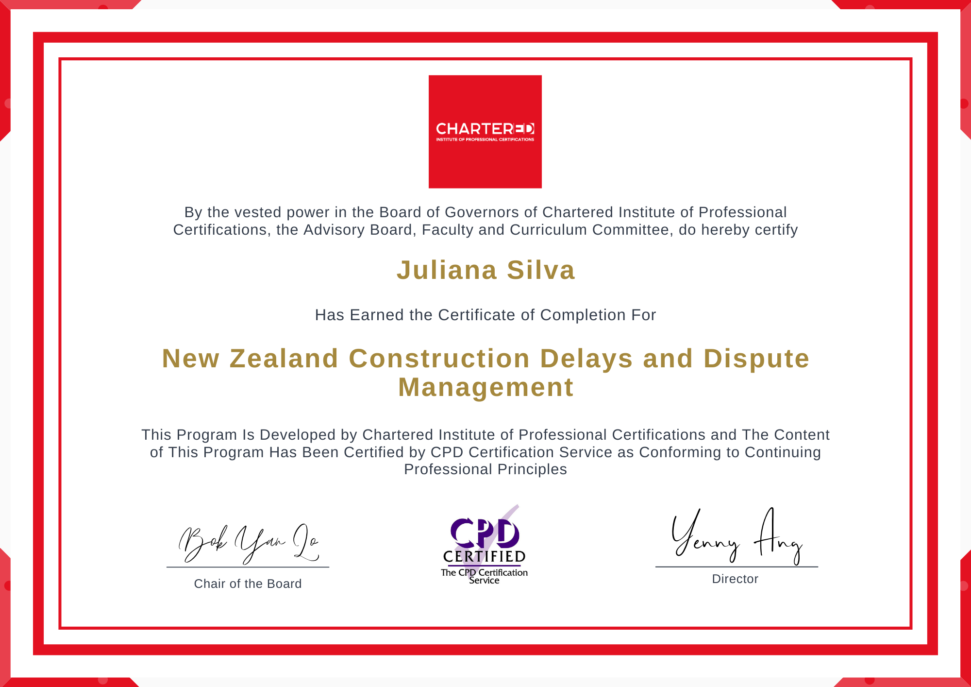 Developed by the Chartered Institute of Professional Certifications, the program is certified by the CPD Certification Service and adheres to the highest standards of continuing professional education. It validates your ability to interpret contract requirements, prepare defensible time and cost claims, conduct effective delay analysis, maintain accurate project records, and apply legal principles to manage and resolve construction disputes. This certification will distinguish you as a trusted leader skilled in preventing disputes, resolving complex delay issues, and strengthening contractual compliance across New Zealand construction projects.
