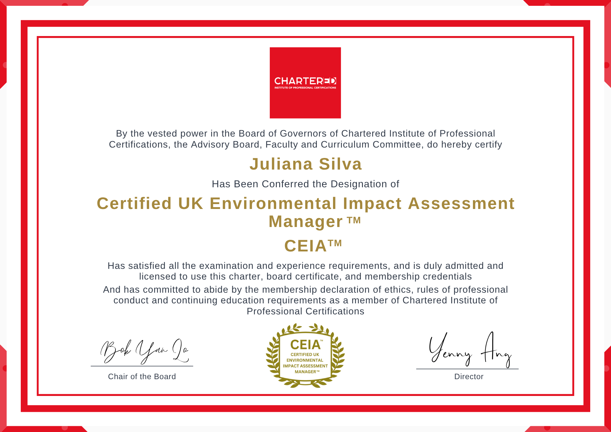 Download Brochure Pricing & RegistrationThis Certified UK Environmental Impact Assessment Manager (CEIA™) program is a mark of distinction that signifies a fully qualified Environmental Impact Assessment professional with compliance and sustainability expertise and skill sets. It is accredited by the Chartered Institute of Professional Certifications, which maintains the governing standards for all members. The CEIA™ charter is a trademarked charter available only to professionals who have completed and passed this program. The certification is governed and maintained by Chartered Institute of Professional Certifications with over 90,000 members around the world. It is also endorsed by prominent associations and organizations worldwide.